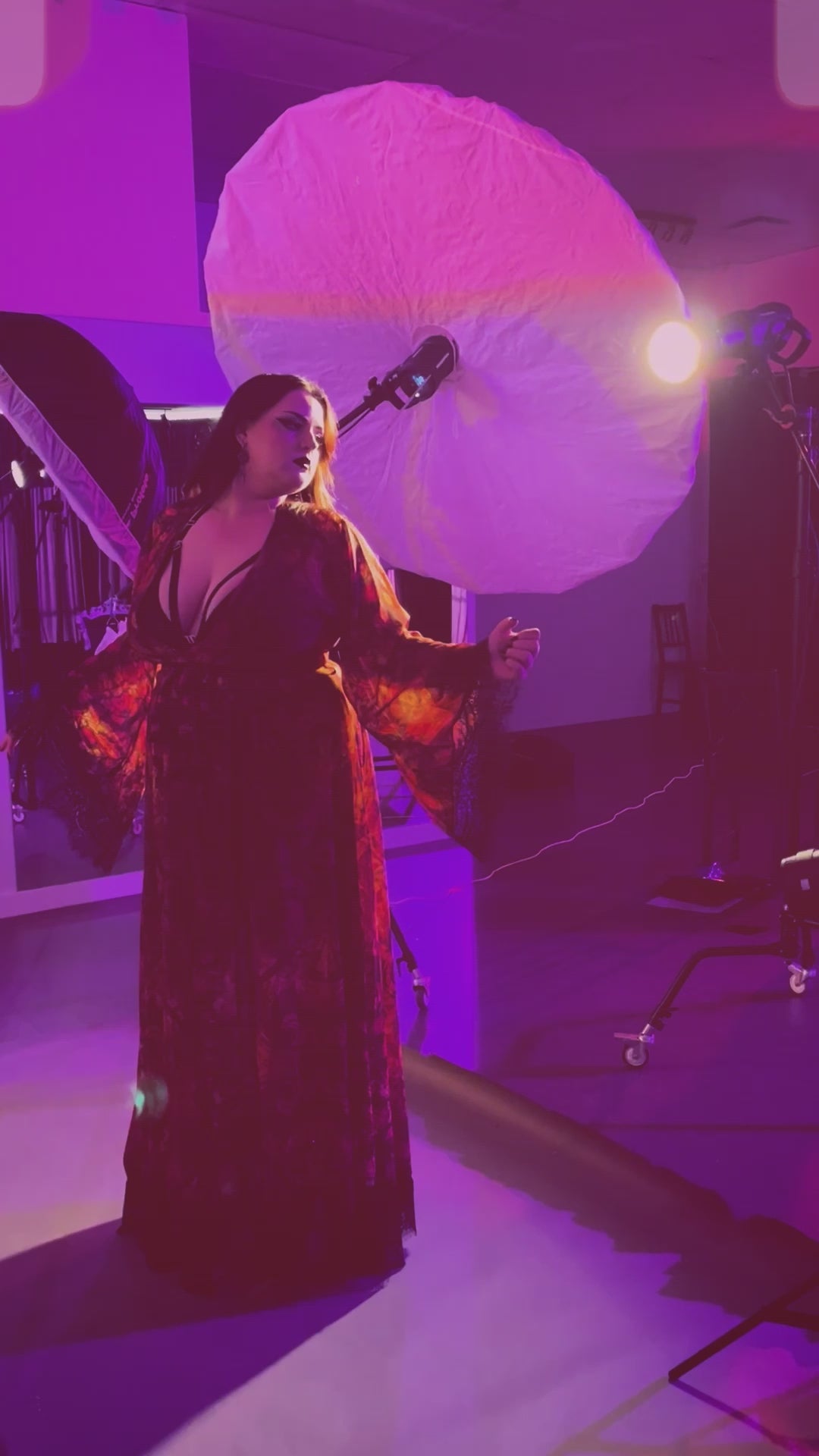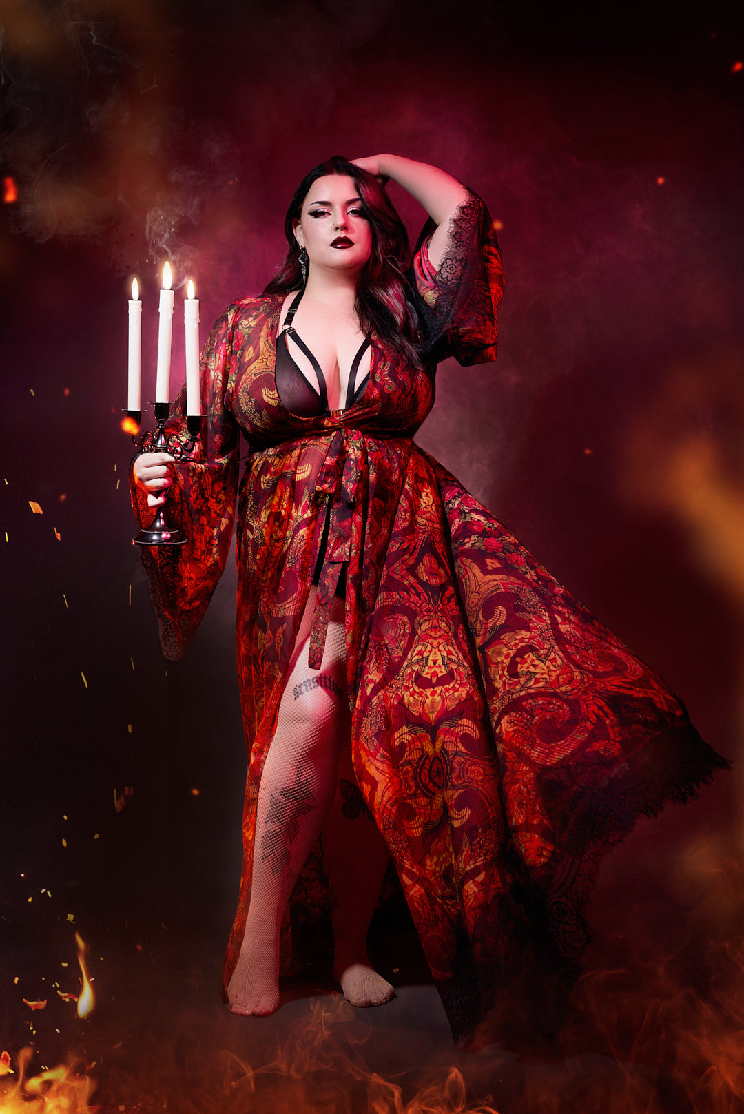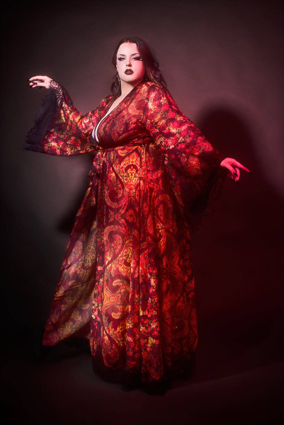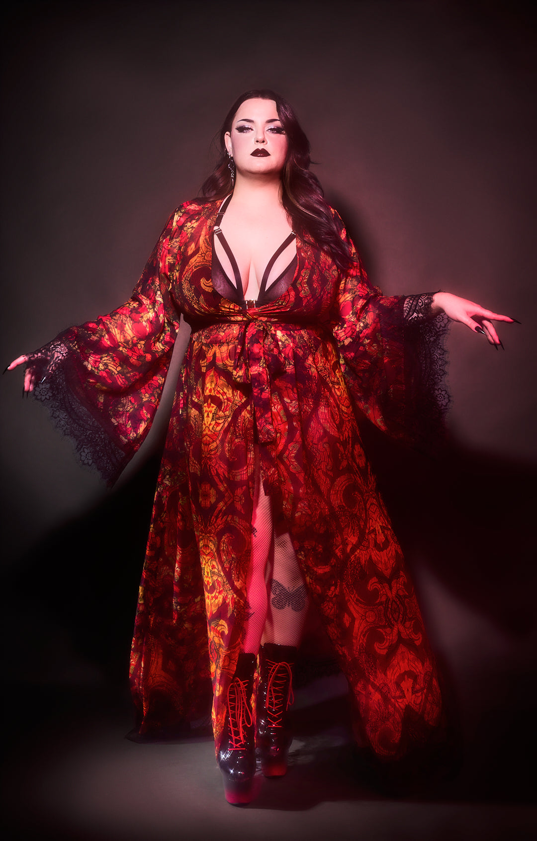 Nyx wears XXL in Bohemian Wrapsody (Ornamental Floral) with our black Vixen Set underneath